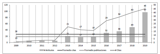 La producción de artículos entre 2009 y 2019 se caracteriza por presentar una tasa de crecimiento promedio de publicaciones de 26 documentos por año, de modo que es 2019 el año con el mayor número de publicaciones y de citas del periodo. Respecto del número de citas, a lo largo del periodo se establecen dos subperiodos de crecimiento por publicaciones y número de citas: el primero entre 2009 y 2013, y el segundo entre 2015 y 2019 (figura 2).