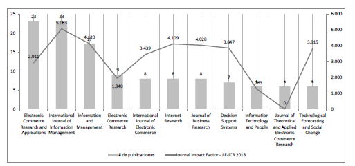 Respecto de las palabras clave, se identificaron 1299 con 2605 repeticiones. Entre ellas sobresalen comercio social (11 %), comercio (3 %), redes sociales (3 %) y comercio electrónico (2 %) (tabla 3). En revistas, se identificaron 121 fuentes en el periodo en que se destaca la participación de Electronic Commerce Research and Applications (8 %), International Journal of Information Management (8 %), Information and Management (6 %), Electronic Commerce Research (3 %) e International Journal of Electronic Commerce (3 %). De acuerdo con el JIF, las revistas más influyentes en el campo son International Journal of Information Management (5,06), Information and Management (4,12) e Internet Research (4,1) (figura 3).