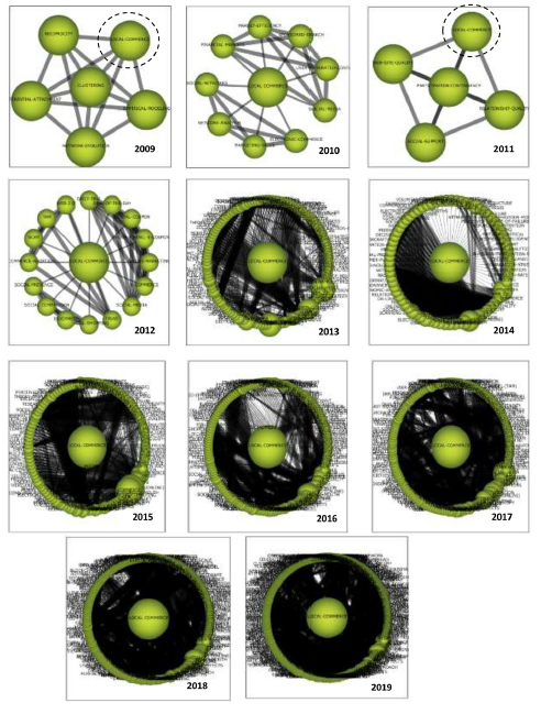 En el análisis de las palabras clave en el periodo, prevalece "comercio local" como la que configura redes temáticas en todos los años de estudio, por lo que desempeña un rol principal o secundario, y así indica que ha sido un aspecto central del análisis. Para 2009 y 2011, el comercio local se caracteriza por ser secundario en desarrollo conceptual de la red de clúster y de participación continua, respectivamente. Para el resto del periodo, el comercio local es el centro de las redes temáticas que con los años va tomando mayor densidad y robustez, lo que significa que es un tema motor dentro del comercio social y ha configurado una comunidad científica (figura 4).