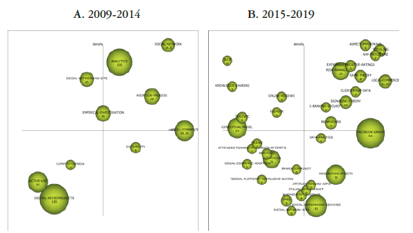Finalmente, en el cuadrante 4, la sociabilidad emerge como un tema importante para el campo del comercio social que no se encuentra aún con amplio desarrollo, lo cual lo convierte en un tema a desarrollar con amplia importancia. Al analizar la figura 2b, se observa la importancia de temas como el comercio local, la teoría de juegos, las ventas al por menor y la gestión del riesgo, entre otros, como los temas centrales del desarrollo en el campo en la segunda parte del periodo, y temas como el análisis de datos, Facebook y los servicios en las redes sociales son los prospectivos del campo. Al comparar los dos periodos, se observa la pérdida de vigencia en la segunda parte de periodo del análisis de las redes sociales y el surgimiento de nuevos temas que lideran el desarrollo de la investigación en el campo.
