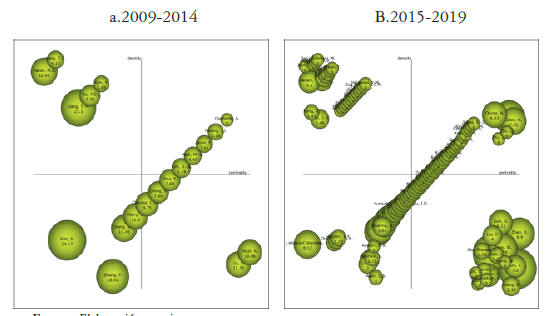 El análisis del diagrama estratégico del promedio de citas 2009-2019 se presenta en dos periodos, entre 2009 y 2014, y entre 2015 y 2019. Se analiza de esta manera para identificar la tendencia entre los dos ciclos identificados en la producción de artículos en el campo. Este mapa estratégico es un mapa bidimensional, donde se analiza la centralidad y densidad de los distitnos términos que clasifican los artículos (figura 5).