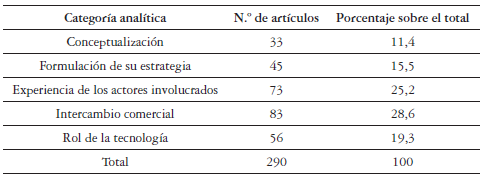 Mediante la descomposición de valores singulares, se clasificaron los artículos según cinco factores identificados con el mayor peso en el análisis: conceptualización, formulación de su estrategia, experiencia de los actores involucrados, intercambio comercial y rol de la tecnología (tabla 1).