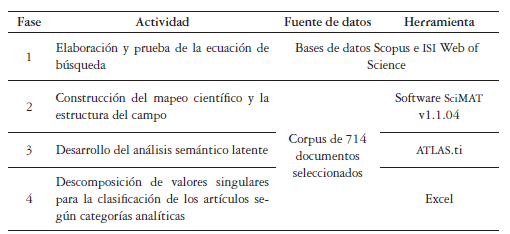 Con esta depuración, se clasificaron y seleccionaron los documentos según los criterios: mayor peso dentro del factor, mayor hg-index y q2-index del autor, mayor impacto en referenciación y mayor JIF en Journal Citation Report (JCR) del journal en relación con el campo. Posterior a la aplicación de los criterios, se seleccionaron 54 artículos, los cuales permitieron caracterizar las categorías analíticas identificadas. Para sintetizar el diseño metodológico, la tabla 2 contiene los aspectos centrales del desarrollo según las cuatro fases presentadas.