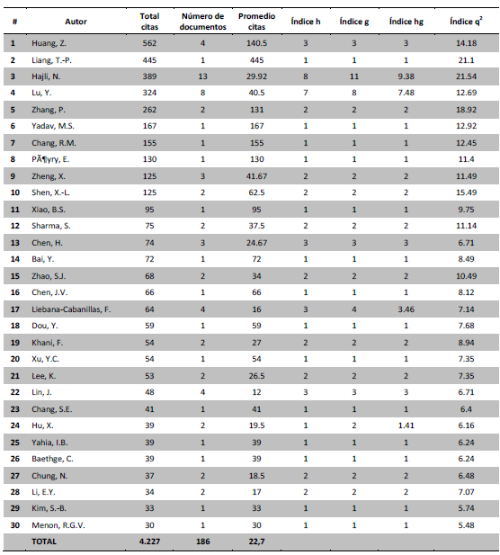 Al comparar la producción de artículos de los autores según los índices h, g, hg y q2, es posible esbozar la relevancia de los autores según el impacto de su producción científica. Respecto del índice h (tabla 4, columna 4), Hajli N. tiene al menos 8 publicaciones que han recibido al menos 8 citas, Lu Y. al menos 7 publicaciones que han recibido al menos 3 citas y Huang Z. al menos 3 publicaciones que han recibido al menos 3 citas.