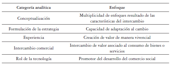 La identificación de los cinco factores que dan forma estructural al comercio social permite describir los rasgos del campo. Con este fin, a continuación, se ampliarán cada una de ellas y se indicarán los elementos centrales plantados por los autores de mayor relevancia en el campo.
