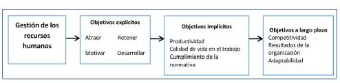 Por su parte, Dollan et al., (2003) plantean que, más que considerar la gestión del talento humano como un conjunto de actividades, hay que considerar primero las relaciones sistémicas existente entre ellas, además de las influencias que sobre estas actividades hay con respecto a la alta gerencia, la cultura, la estrategia, la tecnología y la estructura. Los objetivos de la gestión de recursos humanos según los autores se resumen en la figura 1.