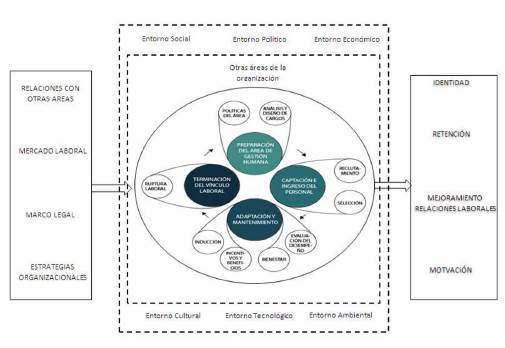 la actividad estratégica de apoyo y soporte a la dirección, compuesta por un conjunto de políticas, planes, programas y actividades, con el objetivo de obtener, formar, motivar, retribuir y desarrollar el personal requerido para generar y potencializar, al management, la cultura organizacional y el capital social, donde se equilibran los diferentes intereses que convergen en la organización para lograr los objetivos de manera efectiva. (García et al., 2008, p.16)