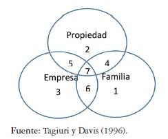 El modelo de los tres círculos plantea que en las empresas familiares existen tres sistemas: familia, empresa y propiedad. El sistema de familia contempla todos los miembros dentro del círculo familiar, en el sistema empresa se encuentran el talento humano ajeno a la familia que participa en el desarrollo del objeto social de la empresa en pro de un beneficio o retorno económico y el sistema propiedad comprende a quienes tienen participación accionaria en la empresa, es decir, los propietarios (figura 1). Al interactuar estos entre sí, se encuentran nuevos subsistemas, en que lo ideal en toda empresa familiar es lograr la armonía en la interacción de estos.