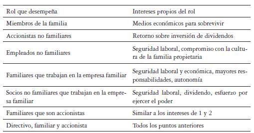 Es pertinente destacar que la causa de los problemas en la etapa de sucesión radica en el conflicto de intereses. Como se mostró, la empresa familiar está compuesta por tres sistemas (familia, empresa y propiedad), los cuales interactúan entre sí y surgen nuevos subsistemas. Los problemas surgen cuando cada uno de los miembros del sistema y subsistema que desempeñan algún cargo tienen intereses personales o propios del rol, los cuales se pueden apreciar en la tabla 2, que indiscutiblemente por la condición humana siempre son a beneficio personal.