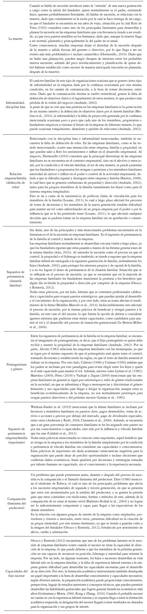 Para abordar los problemas en el proceso de sucesión, es necesario precisar que no se explican desde un solo punto de vista, dado que en este proceso los problemas que se presentan son variados (Lozano, 2011). En la tabla 4, se exponen las situaciones problema identificadas en la revisión y en el análisis bibliográfico, los cuales se dan a causa de la no planificación de la sucesión y el conflicto de intereses que surgen en este proceso y potencian el conflicto de la transición generacional o sucesión en las empresas familiares.