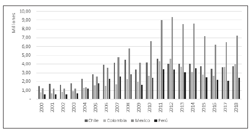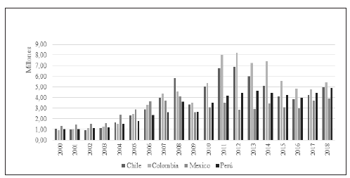 Ahora bien, el comercio intra-Alianza del Pacífico sugiere que no es una relación comercial nueva e incipiente, sino que, por el contrario, es una relación que se sustenta y fortalece a lo largo del tiempo en diferentes acuerdos comerciales bilaterales. Las cifras de comercio intra-Alianza del Pacífico en el siglo XXI muestran flujos todos los años con picos entre 2001 y 2015. En millones de dólares, las importaciones muestran un crecimiento paulatino desde 2000 hasta 2007 para todos los países, en que Chile aumenta sus importaciones a los países de Alianza del Pacífico, mientras que México y Perú registran un comportamiento normal longitudinalmente. Entre 2000 y 2018, el país que más importaciones realizó, desde los países de Alianza del Pacífico, fue Colombia en 2012, superando los US$8000 millones, seguido de Chile que en ese año registró casi US$7000 millones, mientras que para Perú el año de mayor importación fue 2018, cuando llegó a casi US$5000 millones. El país con menor volumen de compra en la Alianza del Pacíico es México, que registró en 2008 un poco más de US$4000 millones (figura 1).