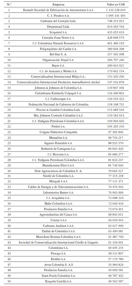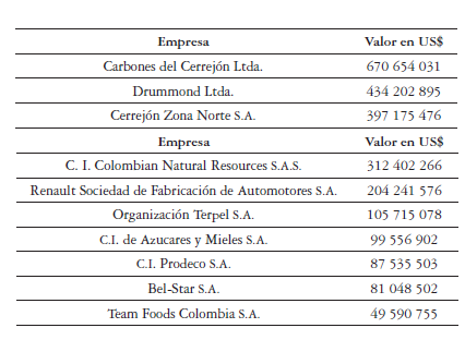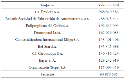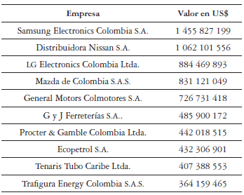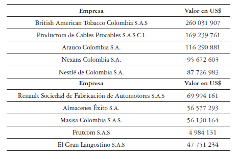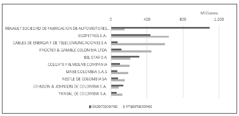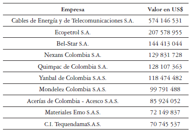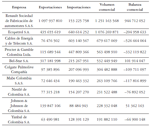 Por tanto, las empresas colombianas que más volumen de importaciones registran son British American Tobacco y Procables. Se observa en la tabla 2 que, de las 10 empresas, el 40 % pertenecen al sector de alimentos como Nestlé, Almacenes Éxito, Frutcom y El Gran Langostino, y el 20 % a la industria de cables como Procables y Nexans. Mientras que otro 20 % está en fabricación y comercialización de celulosa y manufacturas de madera como Arauco y Masisa. Por su parte, Renault está dedicada al ensamble y comercialización de automóviles.