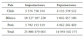 Específicamente, Colombia presenta déficit en su balanza comercial con la Alianza del Pacífico, en que se importa principalmente de México (tabla 1). En cuanto a las exportaciones, estas son homogéneas al resto de Estados parte: en promedio US$5000 millones en los últimos cinco años.