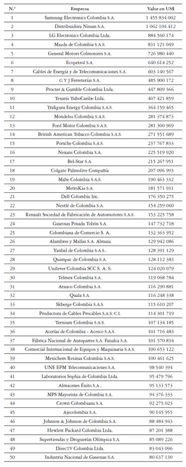 Desde la perspectiva importadora, las empresas con mayor volumen de compra en Colombia están asociadas a las materias primas e insumos como Cables de Energía y Telecomunicaciones y Nexans importadoras de hilos de cobre para la elaboración de cableados, y Ecopetrol en la importación de combustibles livianos. Mientras que las otras compañías como Bei-Star y Yambal del sector de cuidado personal y maquillaje, Quimpac productora de cloro de soda, Mondelez multinacional del sector de snacks, Acerías productora y comercializadora de productos de acero galvanizado y laminado. Materiales Emo perteneciente a la cerámica con productos como pisos, paredes, sanitarios y enchapes, en tanto que la C.I. Tequendama se dedica a la producción y comercialización de aceites premium.