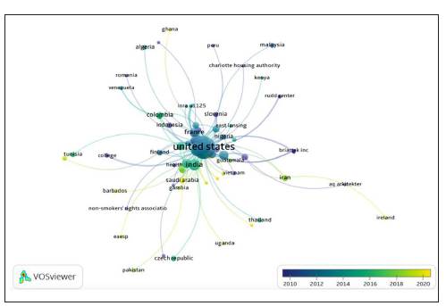 La figura 2 de visualización de la red de datos bibliométricos muestra el incremento de las publicaciones académicas por países que toman como objeto de estudio las tiendas de barrio, que los relaciona, además, con los años de publicación. Se aprecia cómo los Estados Unidos es el país que lidera este tipo de publicaciones, junto con la India, Francia, Japón y Alemania, que muestran mayor concurrencia en los datos de este análisis bibliométrico. Por otra parte, los países latinoamericanos como Brasil, Colombia, Guatemala, Venezuela y Perú lideran las publicaciones sobre la tienda.