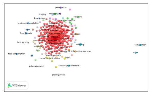 El análisis bibliométrico realizado con VOSviwier identificó y agrupó 26 clústeres y 263 ítems asociados con la oferta de tiendas. Sus ofertas de productos y servicios muestran notorias concurrencias, en que las que obtienen mayor aparición son asociados con temas como oferta de comidas rápidas, tiendas de comida, alcohol, seguridad, ventas al por menor, servicio de internet, tabaco, comportamiento del consumidor, economía urbana, planeación urbana, desarrollo urbano, hogar, etnicidad y estatus socioeconómico, entre otras (figura 3).