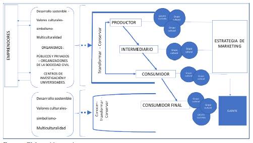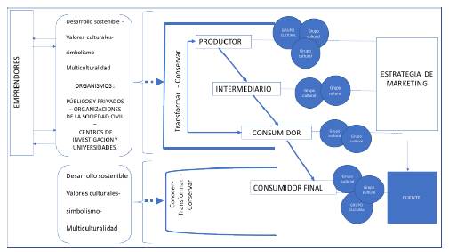 Con la finalidad de mantener las condiciones descritas, se presenta un modelo que integra las siguientes categorías: productores, intermediarios y consumidores (con los elementos transversales del modelo: desarrollo sostenible, multiculturalidad, organizaciones, saberes locales y simbolismos culturales y el etnomarketing) que fueron validados por expertos en el área.