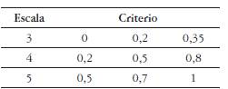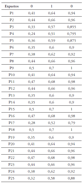 En el criterio de borrosificación, se consideró para el caso de 3 (indiferente) = 0,0.2, 0,35, para el 4 (importante) = 0.2,0.5,0.8 y 5 (muy importante) = 0.5,0.7,1. No se consideró en el criterio de borrosificación la valoración de 1 (nada importante) y 2 (poco importante), debido a que no representaba la opinión favorable de los expertos (tabla 2).