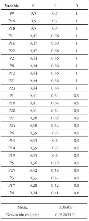 En la tabla 3, se pueden observar los resultados obtenidos de los números fuzzy triangulares para cada una de las variables propuestas para el modelo, donde se puede decir que las variables 4 y 17 no obtuvieron suficiente evidencia para ser consideradas (figura 2).