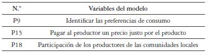 Con la información obtenida, se puede decir que, de acuerdo con las variables evaluadas por los expertos, existió un total consenso en las siguientes variables P9, P15 y P18 (tabla 5). Las variables que se pueden ver en la tabla 6 obtuvieron una evaluación favorable de los expertos, por lo que se pueden considerar dentro del modelo propuesto, debido a que cuentan con un 95 % de nivel de confianza. Finalmente, en las variables P17 y P4 no se obtuvo la suficiente evidencia para ser consideradas como variables centrales del modelo según los expertos.