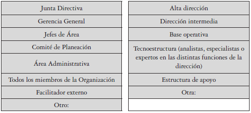 En la primera columna indique con una X quién realiza el proceso de Planeación estratégica en su organización y en la segunda cómo se encuentra adscrito a la organización: