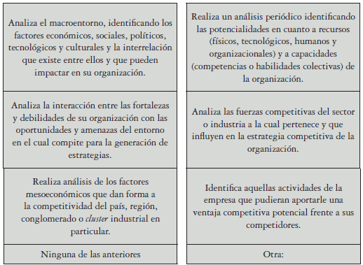 El cuestionario (Anexo 1) indagó acerca de la forma como se lleva a cabo y de los instrumentos que se utilizan para acometer el diagnóstico externo, el diagnóstico interno, la plataforma estratégica, la formulación de estrategias, los niveles del plan, los stakeholders prioritarios, la evaluación y el control, y el responsable del proceso y su nivel jerárquico. Las preguntas necesarias para conocer estos aspectos fueron despojadas de términos técnicos, para que fueran comprendidas plenamente por los encuestados.
