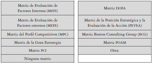Para el desarrollo de esta etapa, la empresa tiene a su disposición un conjunto de herramientas y matrices que le facilitan el ejercicio y la sistematización de la información analizada. Estas deben considerarse como una disponibilidad para la empresa, que no la obliga a utilizarlas todas. El uso de unos y otras depende de la realidad de cada empresa (ver tabla 3).
