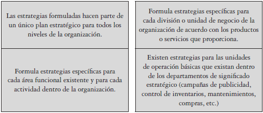 Normalmente la estrategia debe ser formulada en cuatro niveles diferentes, pero que pueden ser complementarias entre sí: corporativa, unidad de negocios, funcional y operativa. Sin embargo, con el criterio de flexibilidad ya señalado, la empresa debe entender sus dinámicas, y de acuerdo con ello definir los niveles en que le es necesario diseñar la estrategia.