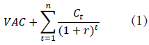Dado que el transporte de funcionarios, desde una perspectiva de la universidad, se puede ver como un problema de costos, se calcula el valor actual de costos (VAC), que es una extensión del criterio de evaluación del Valor Actual Neto (VAN), muy utilizado en finanzas (Sapag y Sapag, 2007; Zúñiga-Jara et al., 2011). Siendo una información fundamental para la toma de decisiones (Améstica et al., 2017) [ver ecuación (1)].