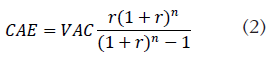 Para determinar el impacto anual de las opciones de transporte propio y transporte externalizado, ya que estas tienen distinto horizonte de evaluación, lo cual imposibilita su comparación, se calculó un indicador complementario, que es el costo anual equivalente (CAE); para lo cual es necesario calcular inicialmente el valor actual de costos (VAC). A partir de la ecuación anterior se puede obtener el costo anual equivalente (CAE) (Riggs et al., 2002), como una medida de comparación de costos, tal y como muestra la ecuación (2):