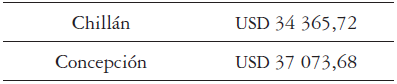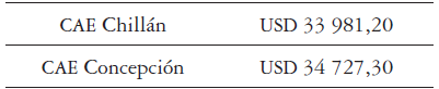 En lo que respecta a las remuneraciones, corresponden a un costo fijo anual que depende de la escala de sueldos que posee la institución; se incluye el total haberes y leyes sociales respectivas de un chofer para cada vehículo. Para el caso de Chillán se consideró una asignación de zona del 15% y en el caso de Concepción de un 20%, lo que hace la diferencia entre ambos sueldos. La información del sueldo promedio de un chofer mensual se obtuvo del sitio web de la institución bajo el concepto de Transparencia Activa, el cual fue USD 1 159,13 para Chillán y USD 1 202,76 para Concepción, lo que arroja un costo anual en remuneraciones de USD 13 909,56 para Chillán y USD 14 433,14 para Concepción. En lo que respecta a los viáticos, el monto institucional, de acuerdo con información proporcionada por el departamento de personal para los choferes, es de USD 11,19 diarios por viaje desde y hacia la ciudad de Concepción, lo que arroja un costo anual por concepto de viáticos de USD 2.461,64 para cada sede, considerando un total de 220 viajes en el año.
