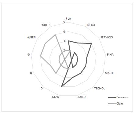 En lo relacionado con la gestión por procesos la valoración se observa lo siguiente: las variables planeación (PLA), información y comunicación (INFCO), gestión financiera (FINA), comercialización y marketing (MARK), gestión tecnológica (TECNOL), gestión jurídica y legal (JURID), calificados con 3, es decir, realizado en intervalos de tiempo, se puede explicar considerando que estos procesos en la dinámica de una empresa pyme, son claves para mantenerse y subsistir con procesos de las compañías para generar resultados inmediatos, lo que hace que el tema de GC se desarrolle en una nivel de importancia diferente y en algunos casos se relegue su desarrollo. En cuanto a los procesos de prestación de servicio (SEVICIO) y gestión de grupos de interés (STAK), calificados con 4, es decir, realizados con regularidad, se explica porque estos son la esencia de las compañías evaluadas; implica que es necesario estar atento al servicio que se presta y a la reacción de los grupos de interés para mantener la organización en funcionamiento.