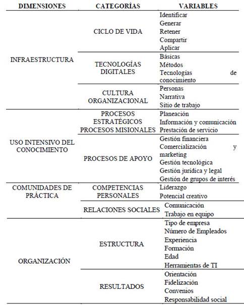 la cual se caracteriza por su perspectiva holística e integradora y desde una perspectiva de gestión por procesos, el cual se validó en las pymes operadoras turísticas del departamento de Caldas de Colombia y se pudo definir una taxonomía básica así: se parte de cuatro dimensiones, con sus respectivas categorías, como son: infraestructura, que contiene las categorías cultura organizacional, tecnologías de información y comunicaciones TI y ciclo de vida del conocimiento; comunidades de práctica CoPs, que contiene las categorías competencias personales y relaciones sociales; uso intensivo del conocimiento, que comprende las categorías procesos misionales, procesos estratégicos y procesos de apoyo, y la dimensión organización, que comprende las categorías estructura y resultados de las pymes.