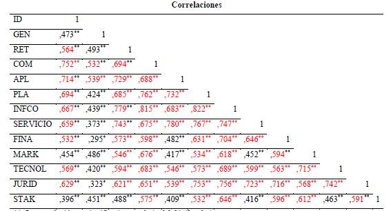Los resultados presentados muestran que existe una correlación significativa entre el ciclo de vida del conocimiento y la gestión de procesos (valores en color rojo por encima de 0,5, que reflejan una correlación moderada, y valores por encima de 0,7, que representan una correlación alta). Estos resultados concuerdan con resultados de investigación como los de Abbas y Sagsan (2019), quienes concluyen que la GC se reconoce como un elemento vital en el diseño, en las estrategias y en el desarrollo de nuevos productos y servicios, al igual que en la gestión de los procesos operacionales. Una gestión eficaz del conocimiento permite a la organización ser más innovadora y eficaz; por esta razón, un número importante de organizaciones toman la GC como un recurso estratégico, que les permite superar a sus competidores.