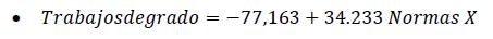 Según los datos empleados, por cada norma implementada por año se crearon 34 trabajos de grado como planes de negocios o proyectos preinversión en el departamento del Meta para el periodo 2006-2018. De acuerdo con el valor del intercepto o constante de la ecuación, se infiere que de no implementarse normas de emprendimiento, dejaron de percibirse 77 trabajos de grado en las IES en estos trece años; en otras palabras, este valor negativo implica que la línea de corte de la regresión, al encontrarse distante de cero, en 77 confirme el efecto positivo de las PPE.