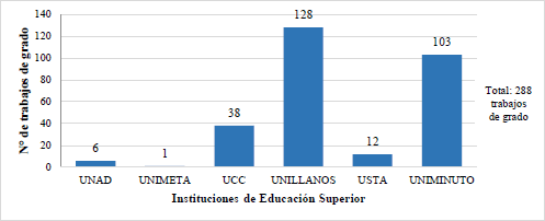 El manejo y consolidación de la información de las seis IES ya mencionadas permite disponer como base 288 trabajos de grado dirigidos al área del emprendimiento en el departamento del Meta, descritos por cantidades así: