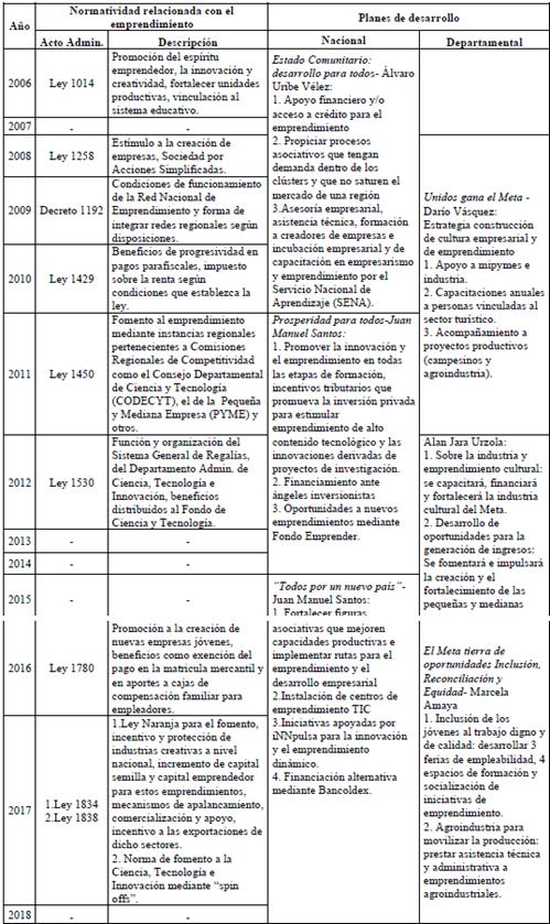 Por último, para mayo de 2019 se promulgó la ordenanza de "Política pública de empleo, emprendimiento y trabajo decente del departamento del Meta 2020-2030. A continuación se presenta la relación de leyes o normas relacionadas con el emprendimiento y algunos apartados estratégicos de los planes de desarrollo tanto nacional como departamental abarcados durante 2006-2018: