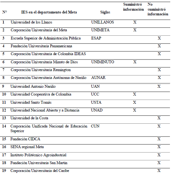 Debido a la escasa disponibilidad y restricción de datos en algunas instituciones (tal como se muestra en la tabla 2) se decidió avanzar con información de seis IES, cinco ubicadas en el municipio de Villavicencio: Universidad de los Llanos (UNILLANOS), Universidad Cooperativa de Colombia (UCC), Corporación Universitaria del Meta (UNIMETA), Universidad Santo Tomás (USTA) y Corporación Universitaria Minuto de Dios (UNIMINUTO); adicionalmente, una localizada en el municipio de Acacías, Universidad Nacional Abierta y a Distancia (UNAD).