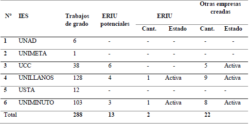 En la tabla anterior se relaciona las ERIU potenciales para cada IES y cuántas de ellas se han reconocido como empresas resultado de investigaciones universitarias distinguidas por registrar año de matrícula mercantil luego de la fecha de publicación del trabajo de grado, obteniendo como resultado un total de 2 ERIU en los trece años de indagación. Igualmente, se describe el estado de funcionamiento de estas empresas, donde para cualquiera de los casos (ERIU u otras empresas creadas) se encuentran activas. El apartado de "Otras empresas creadas" hace referencia a los estudiantes que crearon empresa con diferente objeto social, en contraste con lo estipulado en el proyecto, de modo que las 22 empresas no son consideradas ERIU por su discontinuidad del emprendimiento diseñado en el entorno universitario.