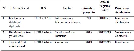 En suma, con esta información se pueden identificar un total de 5 Empresas Resultado de Investigación Universitaria en el departamento del Meta durante el periodo 2006-2018, 2 determinadas por consulta RUES y 3 registradas en la base de datos de la encuesta realizada con información de Colciencias (tabla 4).