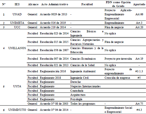 Ahora bien, para complementar el análisis del resultado anterior es indispensable destacar de qué manera ha incidido las políticas públicas y otras medidas gubernamentales en torno al emprendimiento sobre el accionar de las instituciones de educación superior, ya que se desempeña como un agente promotor de desarrollo económico y social. Dicho lo anterior, de acuerdo con los reglamentos universitarios se presentan el alcance, acto administrativo y denominación de emprendimiento como opción de grado que tiene cada IES.