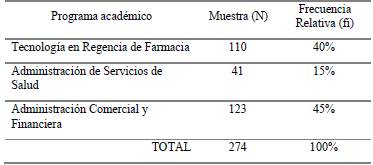La población del estudio estuvo compuesta por estudiantes universitarios de los programas Tecnología en Regencia de Farmacia, Administración de Servicios de Salud (por ciclos propedéuticos) y Administración Comercial y Financiera (por ciclos propedéuticos), en la sede principal del campus universitario en Tunja (Boyacá, Colombia) y los CREAD (Tunja, Duitama, Sogamoso, Chiquinquirá y Garagoa) donde funcionan los programas en el departamento de Boyacá, matriculados para el segundo periodo académico 2021. Se usó el método de muestreo probabilístico, de tipo muestreo aleatorio simple, y se solucionó una muestra de 274 estudiantes (tabla 1), con edades entre 18 a 60 años; el 69 % labora y el 31 % solamente estudia. Se empleó un margen de error descontado la confiabilidad del 0,05 % para un nivel de confianza del 95 %.