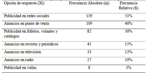 En consecuencia, los resultados arrojan que el 40% prefiere las redes sociales, el 35% gusta en el punto de venta, el 25 % selecciona la publicidad en folletos, volantes y catálogos, el 18 % opta por los anuncios en revistas y periódicos, el 13 % se inclina por anuncios en televisión, 12 % selecciona los anuncios en radio y el 5 % se inclina por la publicidad en vallas para encontrar información publicitaria de los productos de las droguerías (tabla 10).