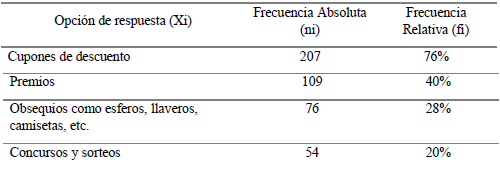 Por consiguiente, al 76 % le agrada los cupones de descuento, el 40 % gusta de los premios, el 28 % se inclina por los obsequios como esferos, llaveros, camisetas, etc., y en menor interés, con el 20 %, los concursos y sorteos (tabla 11).