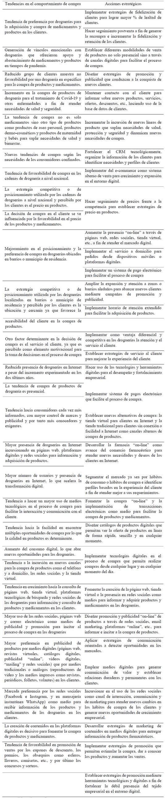 De esta manera, el estudio permitió analizar el comportamiento de compra del cliente de droguerías en tiempos de pandemia por Covid-19 en Boyacá y se identificaron las siguientes tendencias de compra (tabla 12):