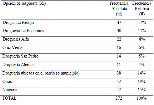 Ahora bien, cuando se indagó por la droguería de preferencia para la compra de productos, el 84 % manifestó tener preferencia por una droguería para la compra de productos. Las droguerías de mayor favorabilidad, en orden descendente, son drogas La Rebaja, droguería la Economía, la droguería Alfa, Cruz Verde, la droguería San Pedro y la droguería Alemana, destacándose por mayor preferencia de compra. En tal sentido, el 17 % opta por drogas la Rebaja, el 1 1% elige la droguería la Economía, el 8% escoge la droguería Alfa, el 6 % se inclina por Cruz Verde, el 5 % prefiere la droguería San Pedro, el 4 % selecciona la droguería Alemana, el 14% acude a la droguería ubicada en el barrio o municipio de residencia, y finalmente el 19% accede a otras droguerías (tabla 3).