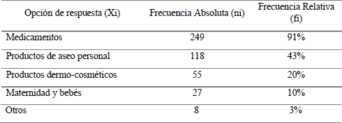 En cuanto a la variable ¿qué compra?, para direccionar a los productos que más compran los clientes en las droguerías tomando en cuenta que son muy visitadas, en especial en estos momentos con la llegada de la pandemia, se observa una marcada inclinación por medicamentos (91 %) que impactan considerablemente en la demanda y venta de los mismos. En segundo lugar se ubicaron los productos de aseo personal (43%), en tercer lugar, los productos dermo-cosméticos (20 %), productos de maternidad y para bebés (10 %), y finalmente, con un menor interés otros artículos (3 %), como productos dentales, vitaminas y suplementos (tabla 4); lo que muestra que los clientes en las droguerías no solo compran medicamentos sino además adquieren otro tipo de productos para suplir sus necesidades de salud y bienestar.