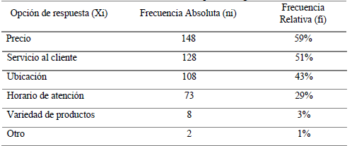 De esta manera, cuando se indaga por los motivos de preferencia en el momento de comprar en una droguería, el 59 % de los clientes se fijan en el precio, el 51 % en el servicio o atención al cliente, el 42 % en la ubicación de la droguería, el 29 % en el horario de atención, el 3% en la variedad de productos y en un menor porcentaje, con el 1 %, la confiabilidad (tabla 5).