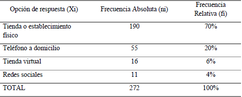 Por consiguiente, cuando se pregunta respecto a dónde compra los productos de la droguería, el 70 % compra en el establecimiento donde funcionan las instalaciones en físico de la droguería o en el punto de venta, el 20 % realiza la compra por teléfono y a domicilio, el 6 % a través de redes sociales, y el 4 % adquiere los productos en la tienda virtual o página web (tabla 6). La tendencia de compra de productos de droguería es presencial.