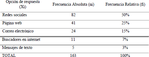 De esta forma, el 50 % muestra su favorabilidad por las redes sociales, el 25 % gusta de la página web, el 15 % prefiere el correo electrónico, el 7 % muestra agrado por los buscadores en Internet y el 3 % opta por los mensajes de texto (SMS) como medio de preferencia para recibir información de los productos de las droguerías a través de internet (tabla 8).